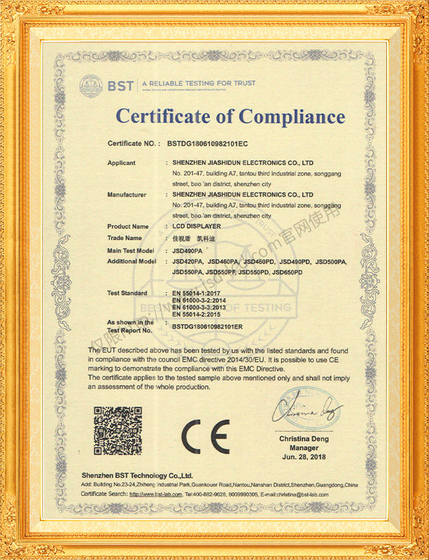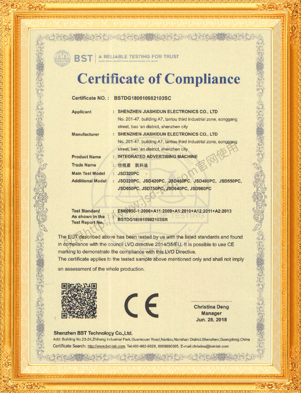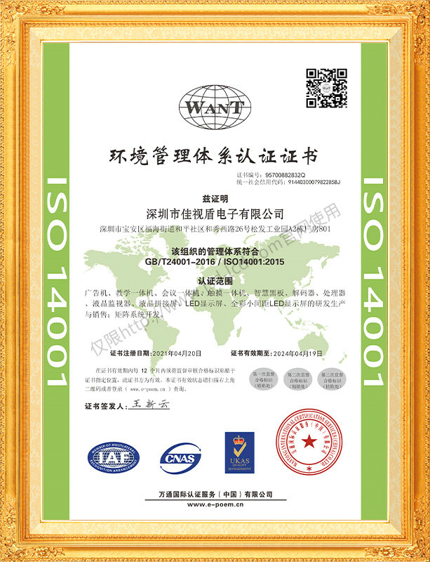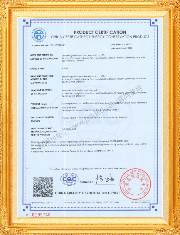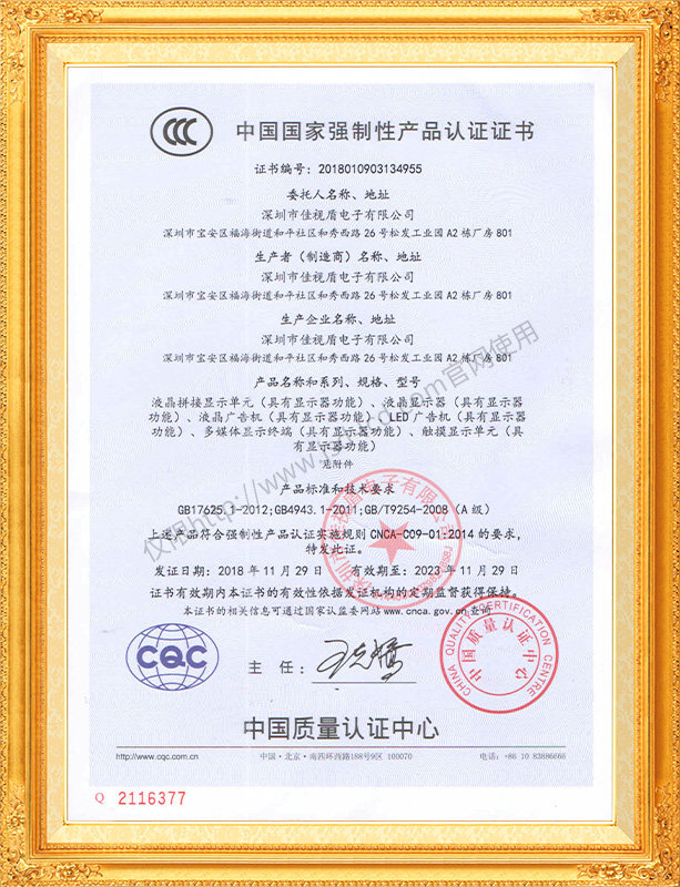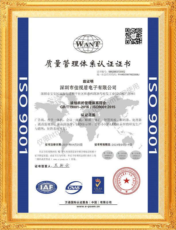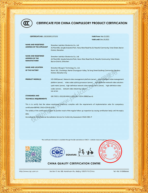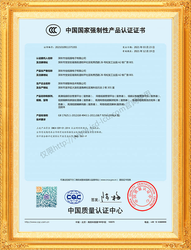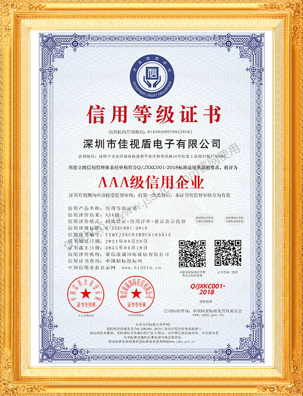 佳視盾科技采用了科學(xué)現(xiàn)代化管理模式,公司和產(chǎn)品通過了CCC、CB、CE、FCC、ROHS、ISO9001、職業(yè)健康管理體系、環(huán)境管理體系,中國節(jié)能認證、多項認證,取得多項專利技術(shù)及多項軟件著作權(quán), 并獲得國家及行業(yè)協(xié)會的多項榮譽證書,所有產(chǎn)品均經(jīng)過嚴格老化檢測及測試,達到行業(yè)優(yōu)等品的出貨標準。